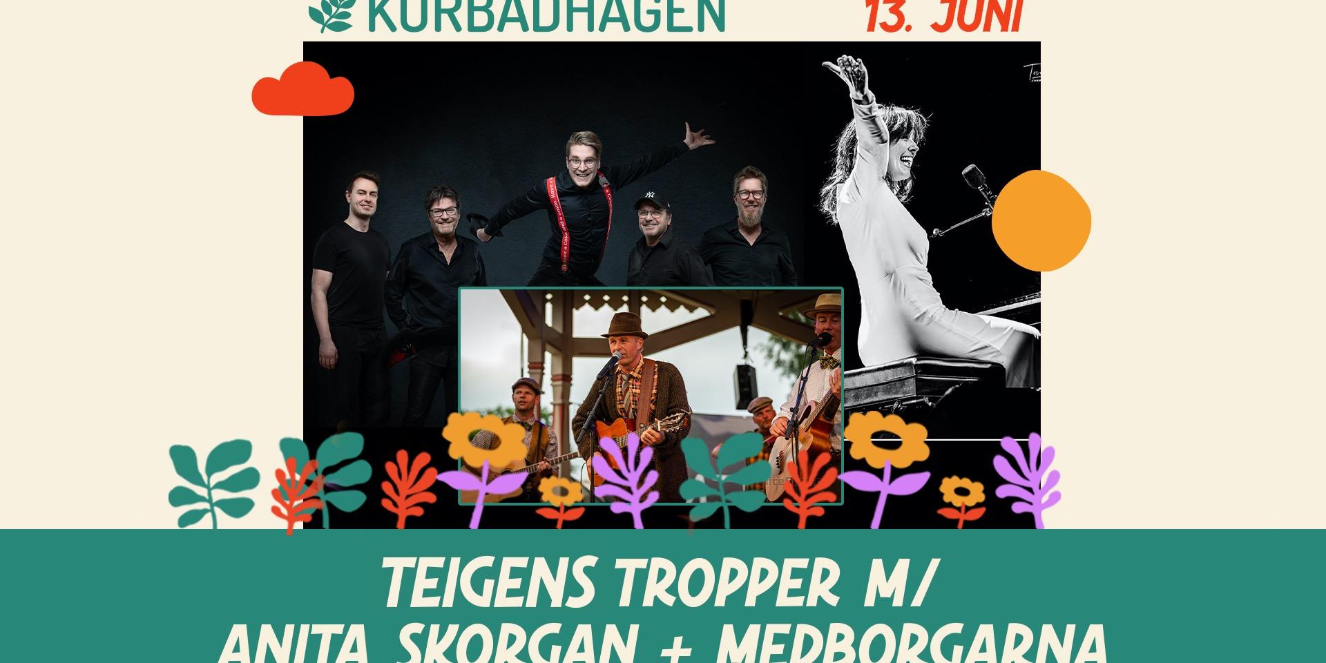 Stor sommerfest fredag 13. juni! Teigens Tropper m/ Anita Skorgan + Medborgarna inntar utescenen. Det blir et forrykende show og garantert allsang med låter som «Optimist», «Det vakreste som finns", «Bli bra igjen", «Min første kjærlighet og «Adieu». Teigens Tropper er det første og eneste bandet i Norge som reiser rundt med offisiell godkjenning fra Teigen Total AS til å bringe Jahns musikalske arv videre. Bandet er satt sammen av Jahn Teigens gitarist gjennom hele hans karriére, Svein Dag Hauge. Med i bandet er også Per Hillestad, Norges mest benyttede studio-trommeslager. Terje Støldal, en av norges mest brukte bassister. På keyboard finner vi Marcus Nilsen. Han er mannen bak mye av musikken du hører på Maskorama, han spilte på Teigens musikal, Optimist, og er en svært flittig benyttet bakmann. Fremst på scenen, med Anita Skorgan er Martin Kristiansen – en fabelaktig artist, sanger og entertainer fra Sarbsborg. En sann Teigen-venn og en garantist for en hyggelig kveld